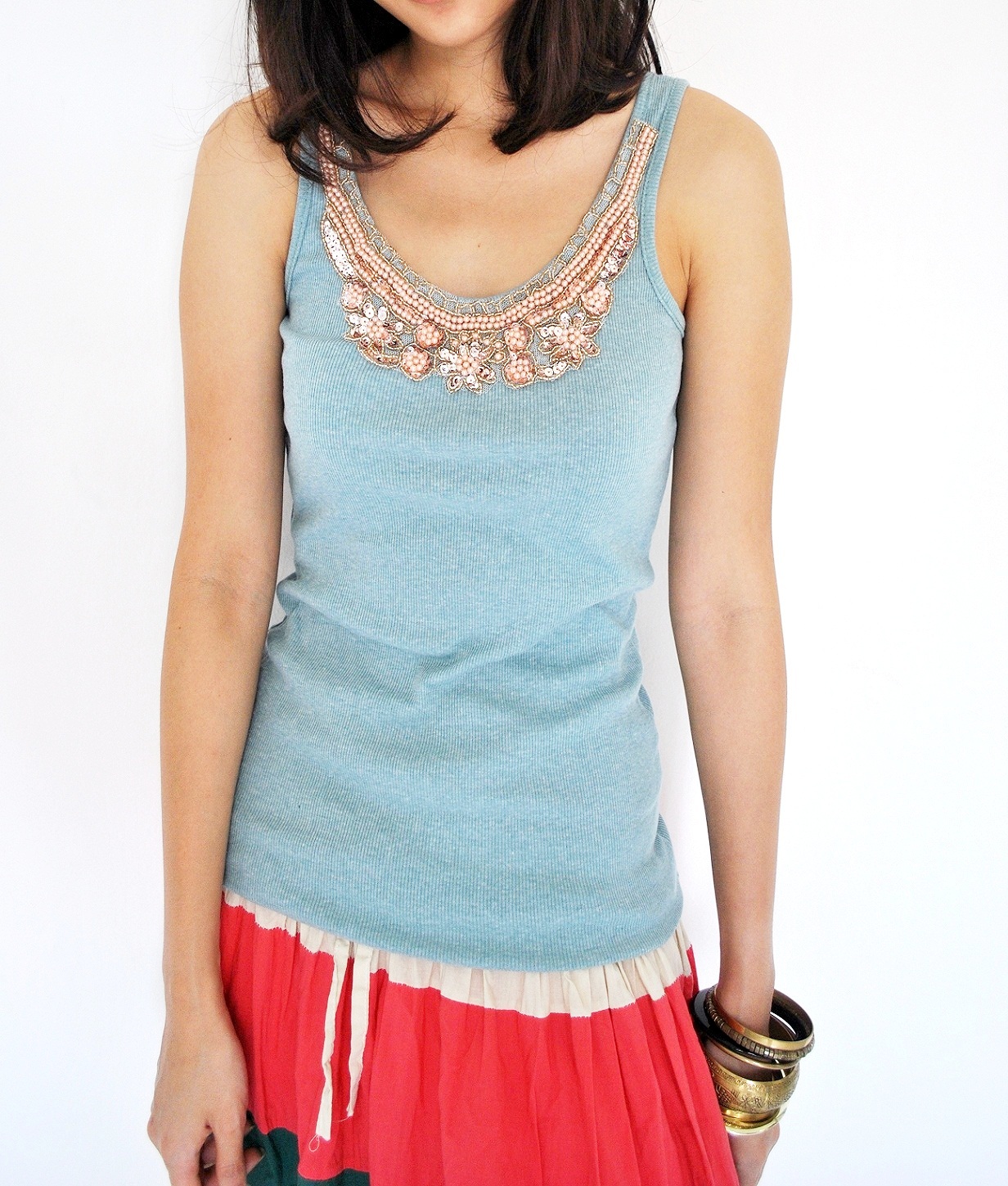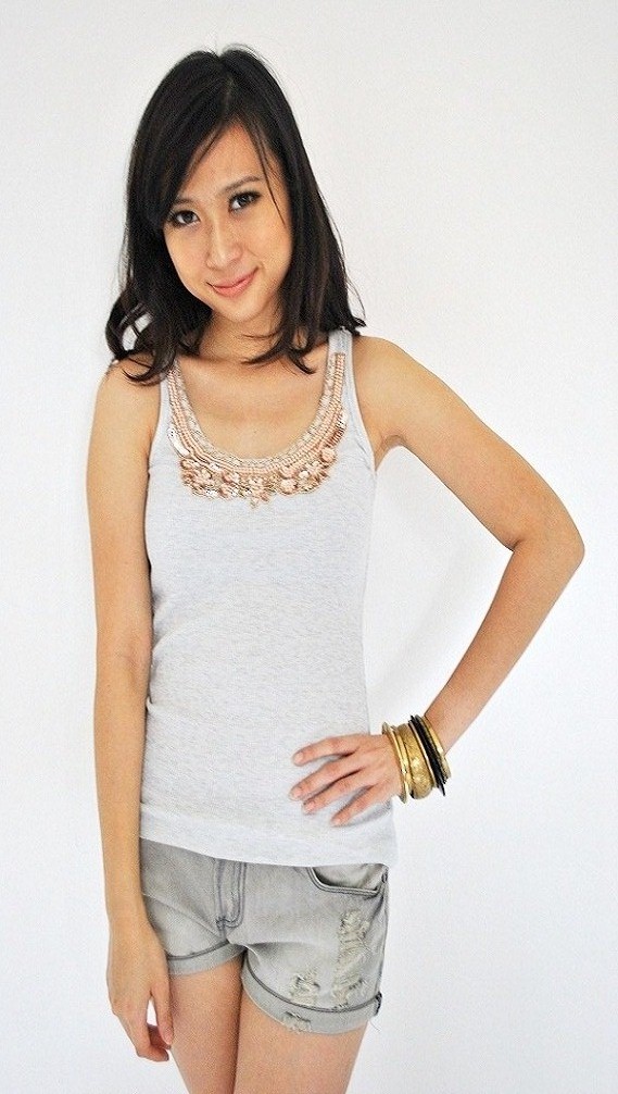Old, plain tank tops boring you? Try a beaded tank top and dress up any outfit! A Vintage-inspired cluster of Beads and Sequins line the neck of a Sporty Ribbed Tank Top!